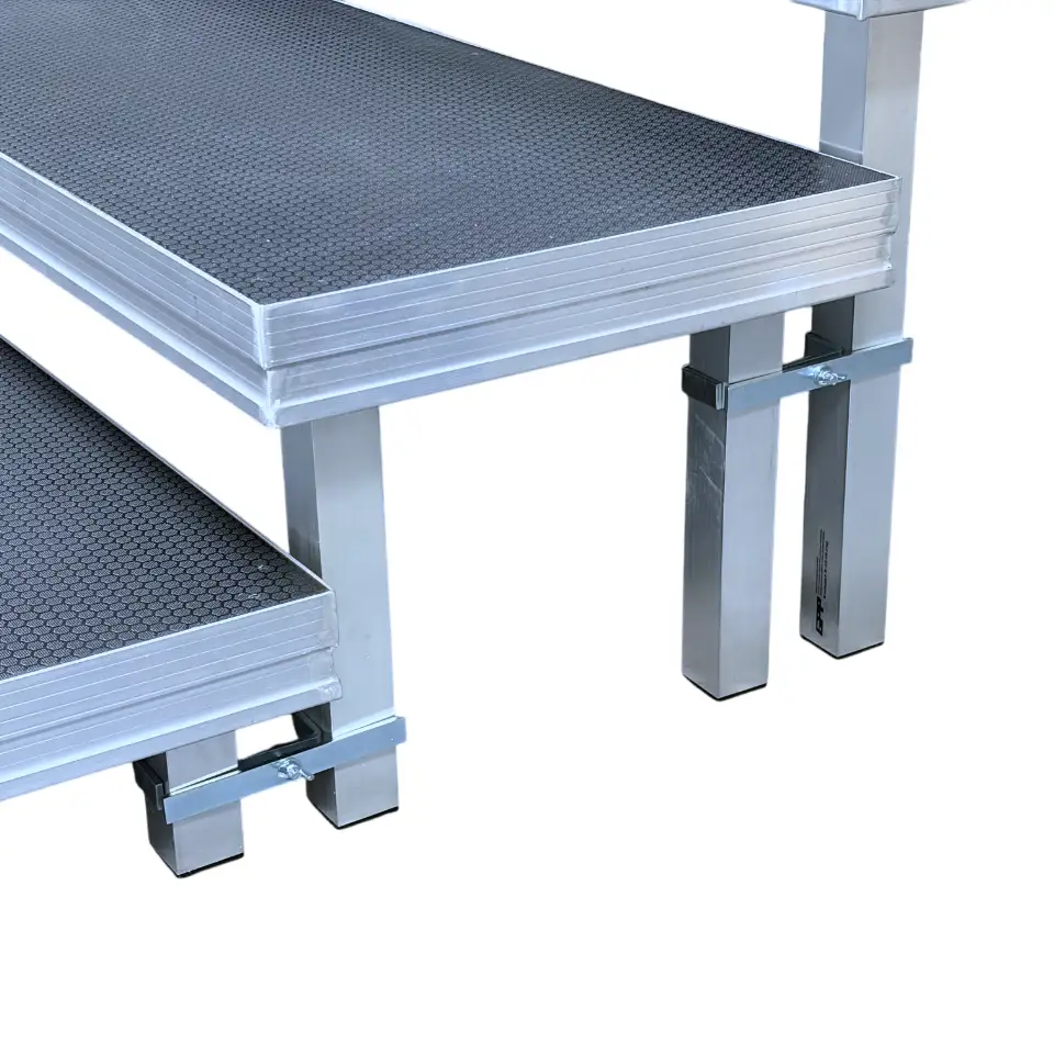Naudojamos įstatomos, nereguliuojamo aukščio aliumininės kojos (50×50×2 mm) su plastikine pėdute, apsaugančia grindų ar kito paviršiaus dangą nuo braižymo. Komplekte yra pakylų ir kojų sujungimo detalės, užtikrinančios konstrukcijos stabilumą.